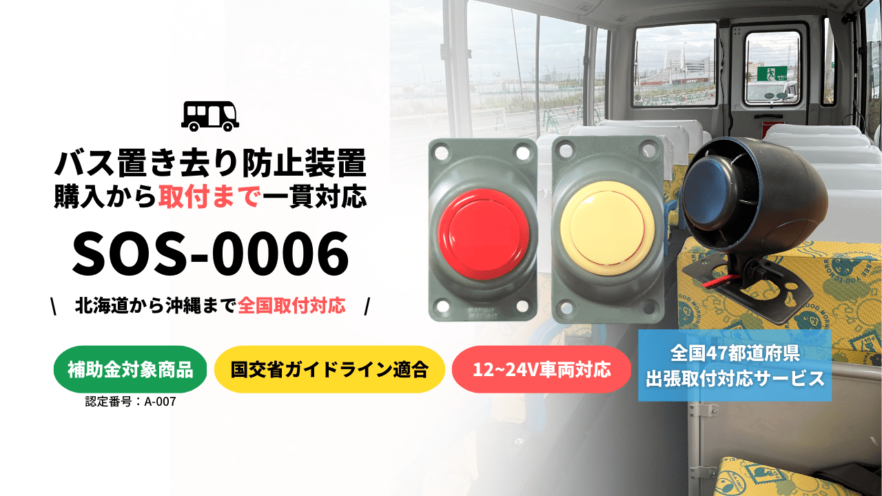 大型バス・中型バス・三列シート車(ミニバン)まで、2023年4月1日の設置義務化対象となるすべての車両に対応しています。DC12V・24V両対応のため電源電圧を問わず取り付け可能です。全国10,000台以上(放課後等デイサービス1,000台以上)の導入実績があります。
